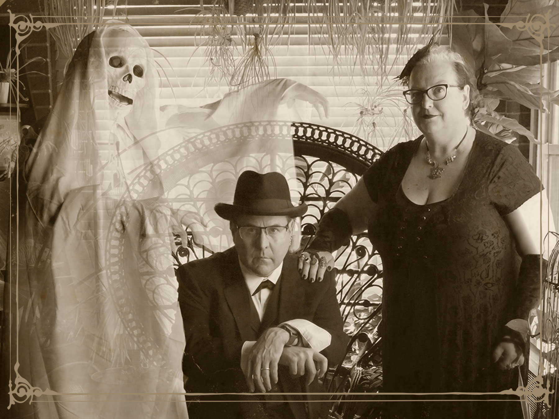After 5 years of using a Coffin Shaped postcard for our Halloween Holiday postcard, we decided to turn the clock back and create a vintage “ghost” photos of our own.